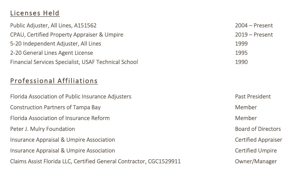 Claims Assist FL, LLC strictly works for the Policyholder and AGAINST the Insurance companies. With over 30 years experience in insurance claims handling, consulting, and negotiating, we are dedicated and passionate about working on behalf of your best interest.